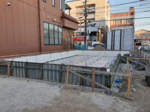 写真では建物外側のみですが、内部の基礎立ち上がり部分にも、型枠を組み、