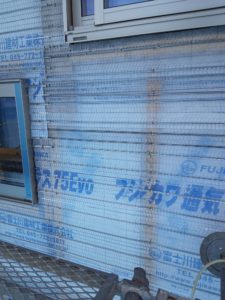 下地ボードのシートが半透明の防水紙になった為 下地胴縁が透けて見えます。
