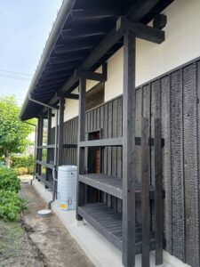 外観は焼杉と漆喰のツートン仕上げで落ち着いた雰囲気となっています。