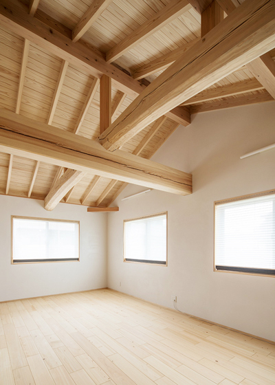 短い工期で大量にローコスト生産できるプレカット工法に対し、私たちの家づくりは「手刻みによる木組み」が主体。古来より日本の職人たちによって受け継がれてきた、高い技術が求められる伝統工法のひとつです。一般的には天井などで隠れてしまう梁などの構造部分も、目に見える「あらわし」で仕上げることができ、木組みならではの迫力ある美しさを実現できます。