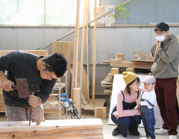 継ぎ手や仕口の役割、加工の仕方、道具の使い方などの実演をしたり、「この材はここの柱になります」「この美しい木目がリビングの天井に見えるようになります」といった説明を、棟梁みずから行います。手刻みのメリットのひとつである、機械では作れない強固な仕掛けと気配りを間近で見学していただき、木の家の良さをお伝えしています。