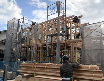 機械加工ができない大梁の加工や上下を組み合わせる渡り顎(あご)工法などは大工による手仕事の見せどころ。美しい木組みが組みあがっていく様は迫力があり、見ているだけで感動します。ご希望により上棟式をして、お施主様と大工さん・担当者でお弁当をいただきます。作り手と住まい手が協力しあって、ここから完成まで力を合わせます。
