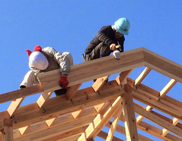社員大工が集まり、一日で棟上げを手際よく一気に行い、屋根仕舞いまで終わらせます。