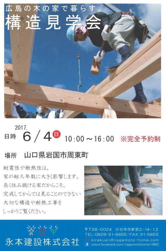 日付 : 6月4日(日) 時間 : 10時~16時 場所 : 山口県岩国市周東町 ※完全予約制 場所の詳細につきましてはご連絡ください。 美しい広島の県産材を、職人の手で刻んで組み上げています! 完成してからでは見ることのできない構造や断熱をご覧いただくことができます。