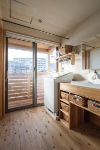 ひとつは洗面脱衣室に面しており、物干し場として活用している西側のバルコニー。洗濯機から取り出した洗濯物はすぐそばのランドリーパイプを使ってハンガーやピンチで整え、そのまま外へ出て干すことができ実用的。 乾いた洗濯物をしまうクロゼットもすぐそばに配置されていて、洗濯の全てがここで完結する家事導線を叶えました。