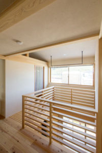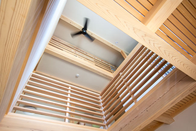 リビングの吹き抜けを見上げると、2階、その上のロフトまで見渡せます。