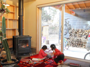 薪ストーブの前は子どもたちのお気に入りの場所。