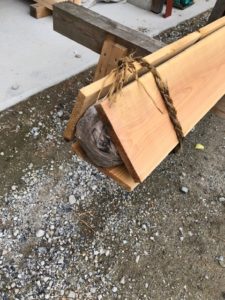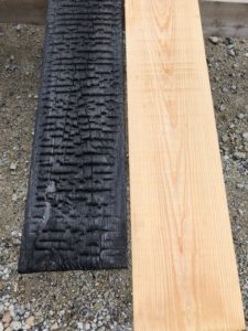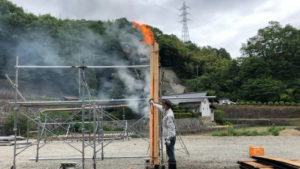 販売されている杉板は4寸巾ぐらいで厚みも4分または5分(なぜかセンチではなく寸表示)バーナーで表面をうっすら焼いてあるのが普及品です。そこでもっと幅広くもっと分厚いものをしっかりと焼き上げた杉板はないのだろうかといろいろと調べたら静岡県の天竜杉の焼き杉の動画が目に留まった。注文すれば届くのだろうが、地元の木材を使う永本建設としては自社で製作するしかないだろうと7分の幅広の板を製材所に頼み1か月の天日干し、含水率が20%を切ったところで焼き上げてみました。